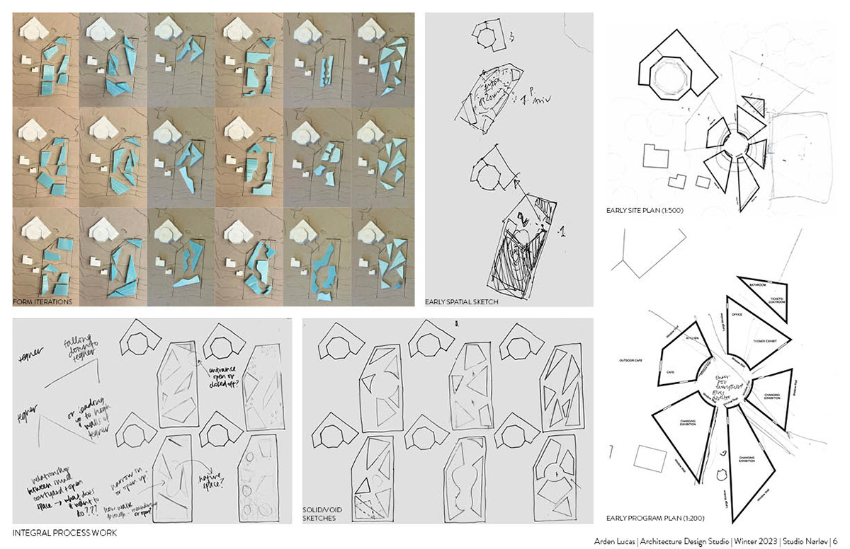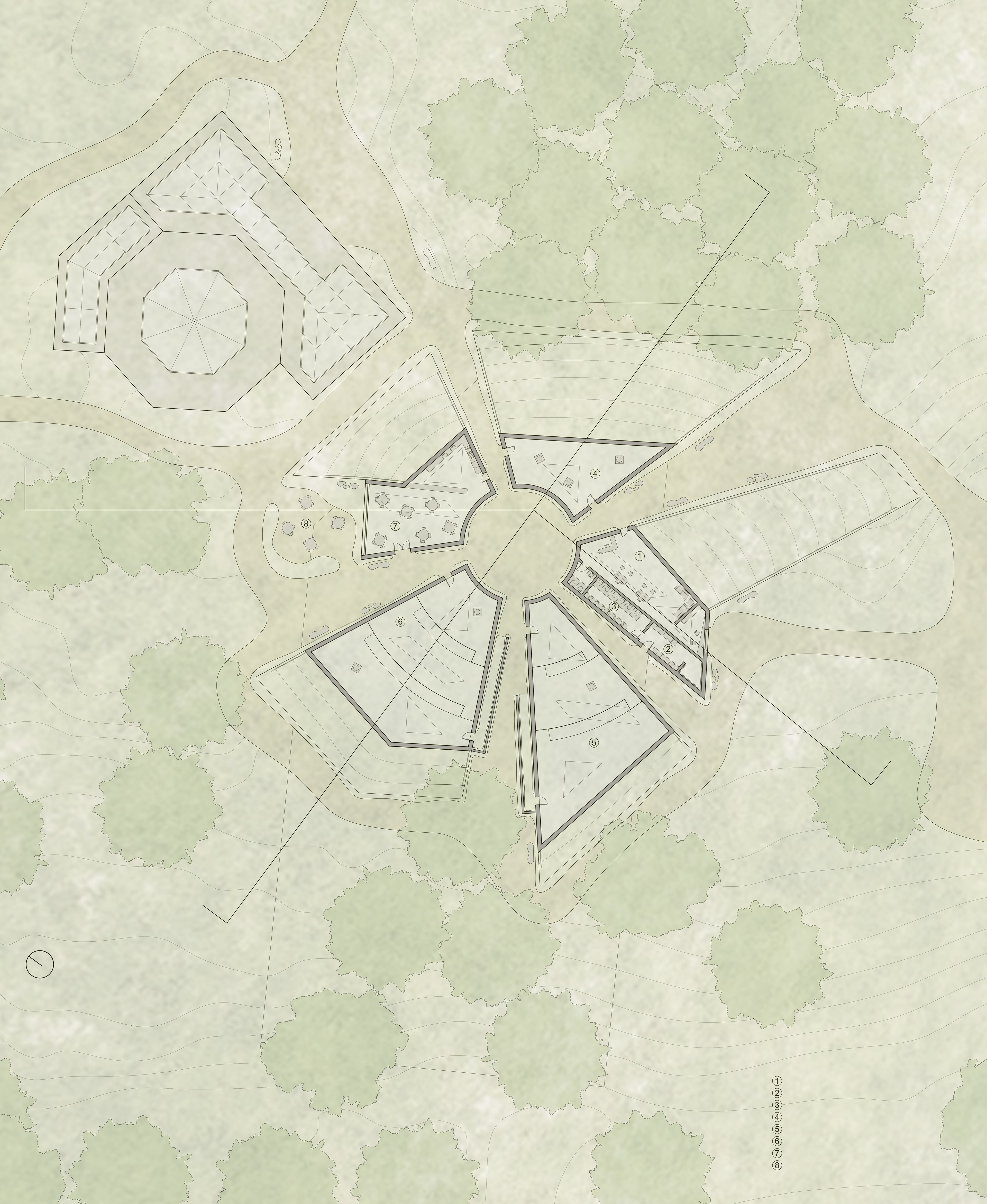 Interstitial is an extension of Tegner’s Museum that is designed to create a more seamless connection between the extensive landscape and the monolithic existing building. While the existing museum’s relation to the surrounding nature is sharply defined, the extension explores the interstices between landscape and nature by introducing space that is outdoors but closely between building walls. The center circle and spaces in between each building are meant to provide a place for visitors to contemplate our relationship to both nature and what is built.